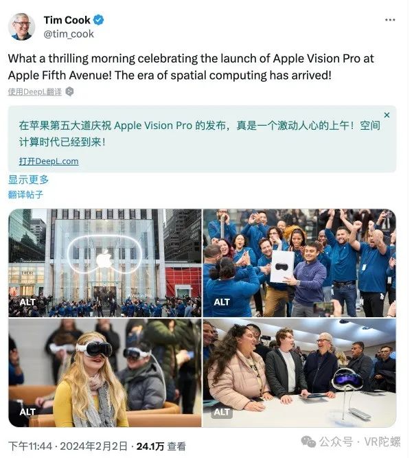 苹果CEO库克庆祝Vision Pro上市:空间计算时代已经到来!